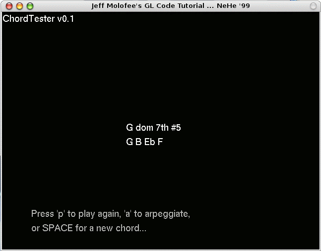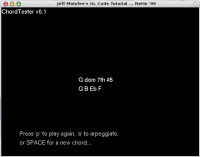 Here is a very first screenshot of ChordTester running on Linux (yes, my Linux looks like a Mac!). You can see from the window title that there are a LOT of changes still to be made. Although it looked disgusting, version 0.1 did function pretty well, and that's what matters, right? | ||